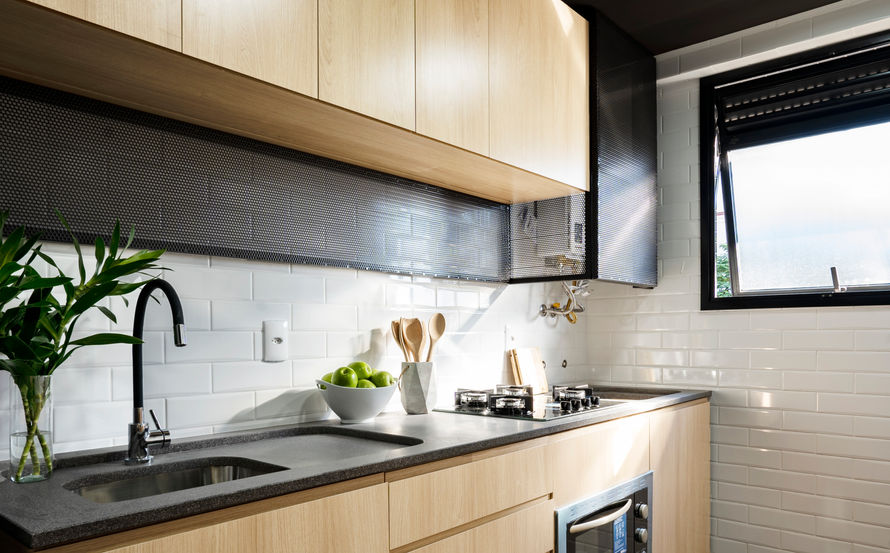 Na cozinha, o volume da churrasqueira protege o serviço da vista social e foi todo envolto com arte! Os tons neutros de todo o projeto destacam os desenhos do artista Giuliano Martinuzzo, que também espalhou seu trabalho pelas paredes da suíte, trazendo a unidade que desejávamos para o apartamento. Projeto em coautoria com Oficina Conceito.